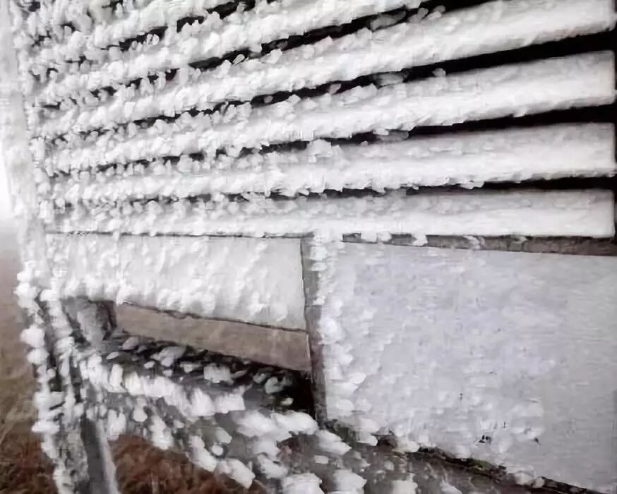 结冰的的产生对设备的使用寿命和工作性能影响非常大,如果结冰发生在进风口,那么伴随着冰块积聚,冰块重量逐渐增加,容易造成百叶窗的破损,使之失去导风效能,如果结冰位置发生在集水盘,那么由于结冰过程冰块体积增加将导致玻璃钢集水盘受膨胀作用力而破裂,造成漏水,等等…