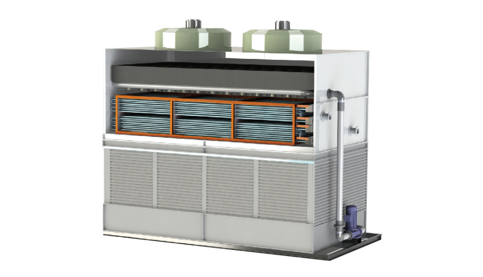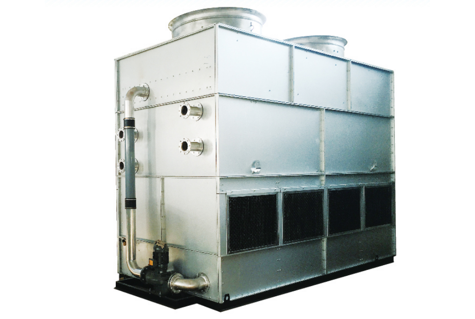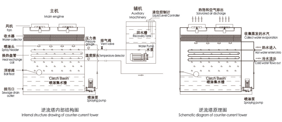 工作流体(软水或其他液体)在闭式冷却塔的盘管循环,流体热量被盘管的管壁吸收后,通过冷却器上侧部的风机把管壁热量排出机外。