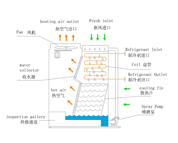 热的(气态)制冷剂流从上部进入换热器盘管内,管外的喷淋水与空气横向与逆向流动且掠过盘管外壁与管内制冷剂进行换热,冷凝后的液态制冷剂由系统循环泵送再往热源。