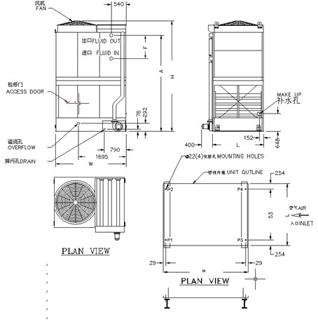 从塔的上部和下部进风,分别流过管束和填料,可产生较大的空气流通面积, 流动阻力小,换热性能好。